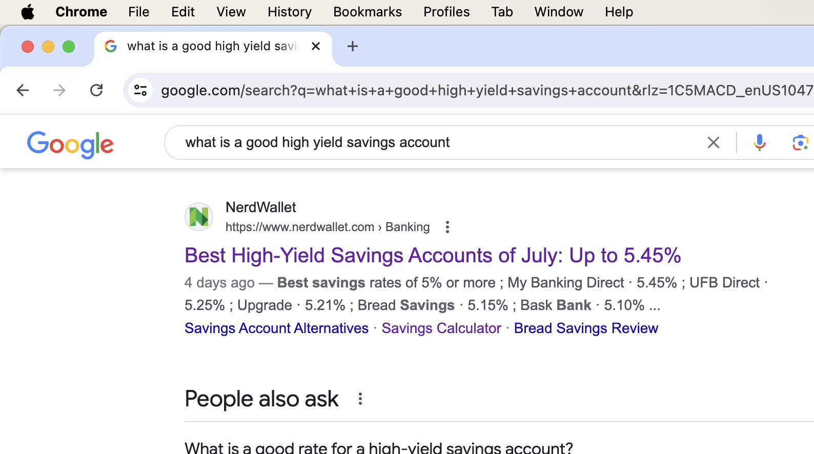 A web page titled “Best High-Yield Savings Account of July: Up to 5.45%” popped up and I clicked the link.